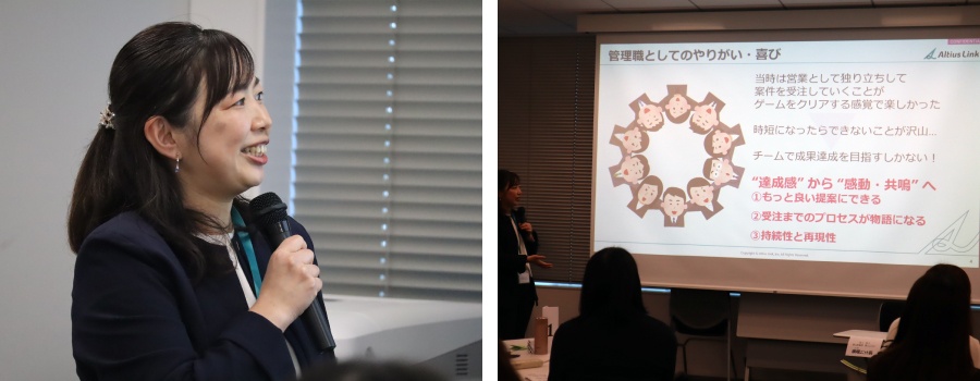 今回の研修では、実際に管理職として活躍している2名の社員が登壇し、管理職としてのチャレンジや、仕事との向き合い方、ライフイベントとの調整など、リアルな経験を語りました。