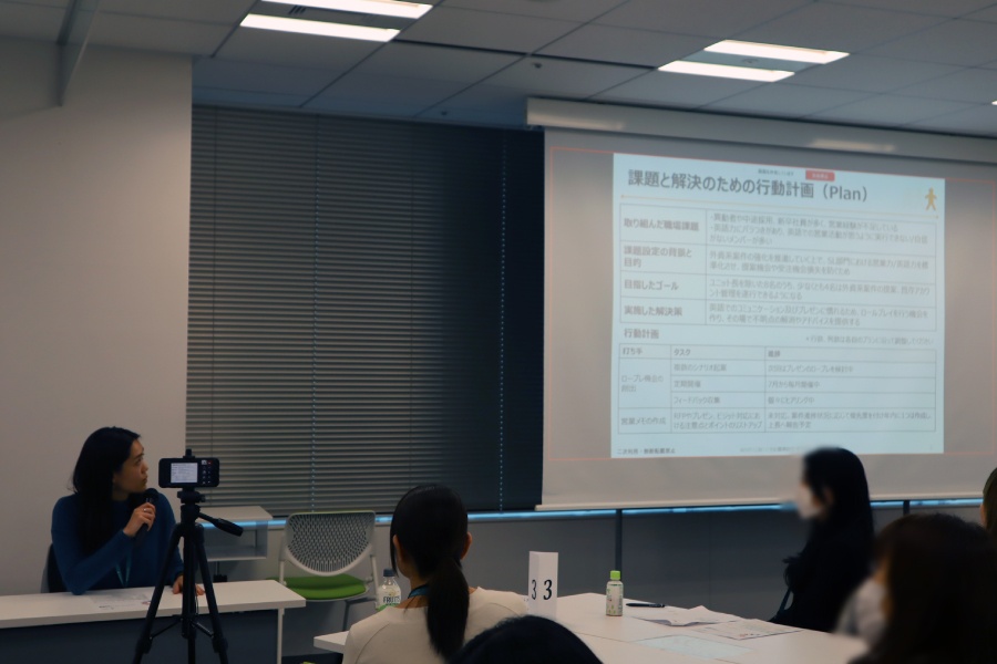 3回にわたる研修も今日が最後。これまで学んできたことや感じたこと、日々の業務で実践したことや今後に向けた取り組みについて、グループの代表者が発表しました。実践したこととして、メンバーの主体的な行動を促す施策や、「周りを巻き込む」リーダーシップを発揮し生産性向上につなげた事例など、研修で得た知識やスキルを組織の成長・改善につなげることができました。