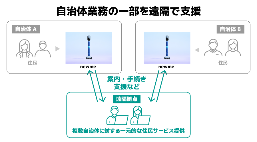 こうした背景のもと、avatarin(株)が独自開発したアバターロボット「newme(ニューミー)」とアルティウスリンクが培ってきたBPOのノウハウを融合させ、住民サービスの質向上と自治体業務の効率化を同時に実現することを目指す「遠隔BPO」の確立に向けた協業を開始します。