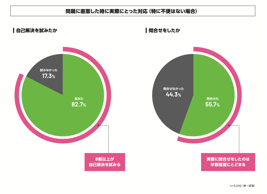 困りごとがあった場合、約8割が「自己解決を試みた」と回答する一方で、実際に問合せをした人は全体の半数にとどまり、自己解決できなければ諦める層が一定数いることがわかりました。