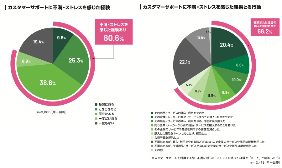 - 約8割がカスタマーサポートでの不満経験あり、購買行動にも影響。離脱防止策を講じることが重要