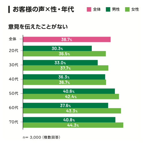 企業に対して「意見を伝えたことがない」人は全体の3割以上で、消費者の6割が「お客様の声」を伝えた経験があり、若年層ほど積極的にフィードバックする傾向が見られました。企業は、店舗、コールセンター、メールなど多様なフィードバック手段を通じて、消費者が意見を伝えやすい環境を整えることで、お客様の声をより多く収集することが期待されます。