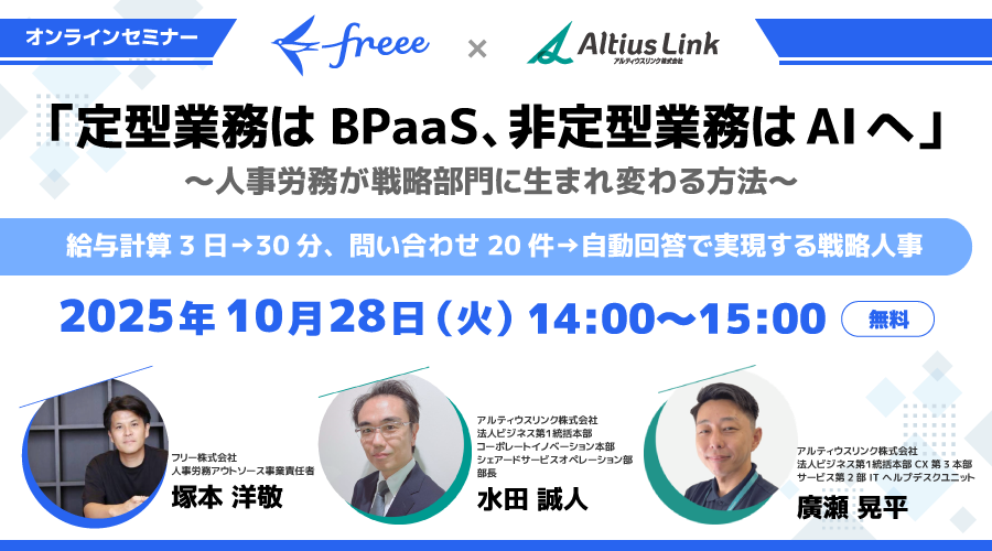 アルティウスリンク株式会社(所在地:東京都渋谷区、代表取締役社長:那谷 雅敏、以下 アルティウスリンク)は、フリー株式会社(本社:東京都品川区、CEO:佐々木 大輔、以下 freee)と、2025年10月28日(火)に共催オンラインセミナー「 『定型業務はBPaaS、非定型業務はAIへ』 〜人事労務が戦略部門に生まれ変わる方法〜」を開催します。