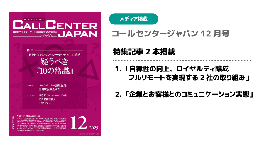 リックテレコムが発行する「月刊コールセンタージャパン」12月号の特集企画「FOCUS」にて、「フルリモートを実現する2社の取り組み」を紹介する記事と、当社の調査レポート「企業とお客様とのコミュニケーション実態」に関する特集記事の2本が掲載されました。