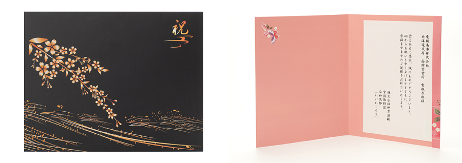 ゴールドを基調にした華やかなデザインの台紙です。栄誉・昇進への祝賀をはじめ、さまざまなお祝いシーンでご利用いただけます。