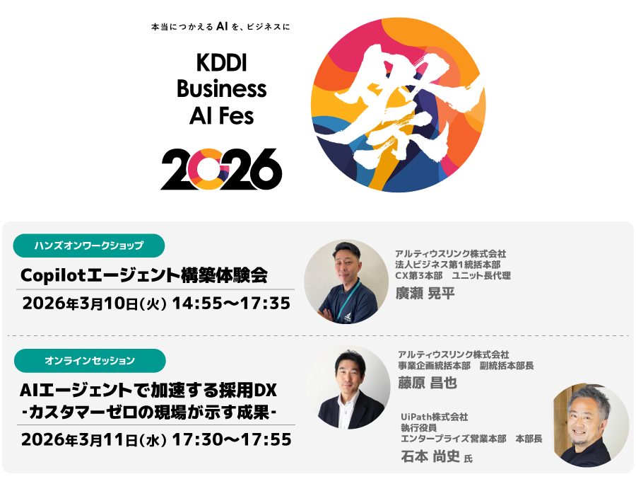 アルティウスリンク株式会社(所在地:東京都渋谷区、代表取締役社長:那谷 雅敏、以下 アルティウスリンク)は、2026年3月10日・11日にKDDI主催の「KDDI Business AI Fes 2026」において、オンラインセッションおよびハンズオンワークショップに登壇します。