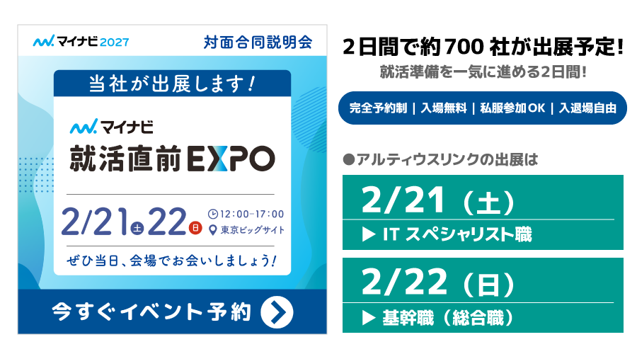 アルティウスリンク株式会社(所在地:東京都渋谷区、代表取締役社長:那谷 雅敏、以下 アルティウスリンク)は、東京ビッグサイトで開催される「マイナビ就活直前EXPO」に2月21日(土)はITスペシャリスト職、22日(日)は基幹職(総合職)のブースを出展します。本イベントは、2日間で約700社が出展し、企業理解を深めながら就活準備を一気に進められる合同説明会です。会場には、就活準備に役立つコンテンツや3月の就活解禁に向けたポイントなどもご紹介しています。学生の皆様のご参加をお待ちしております。